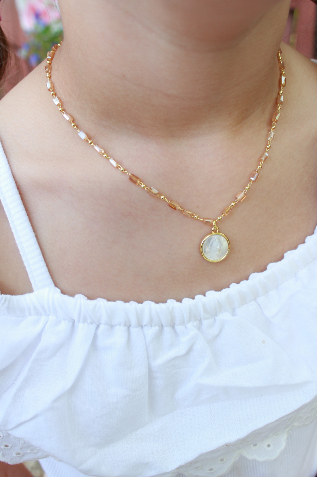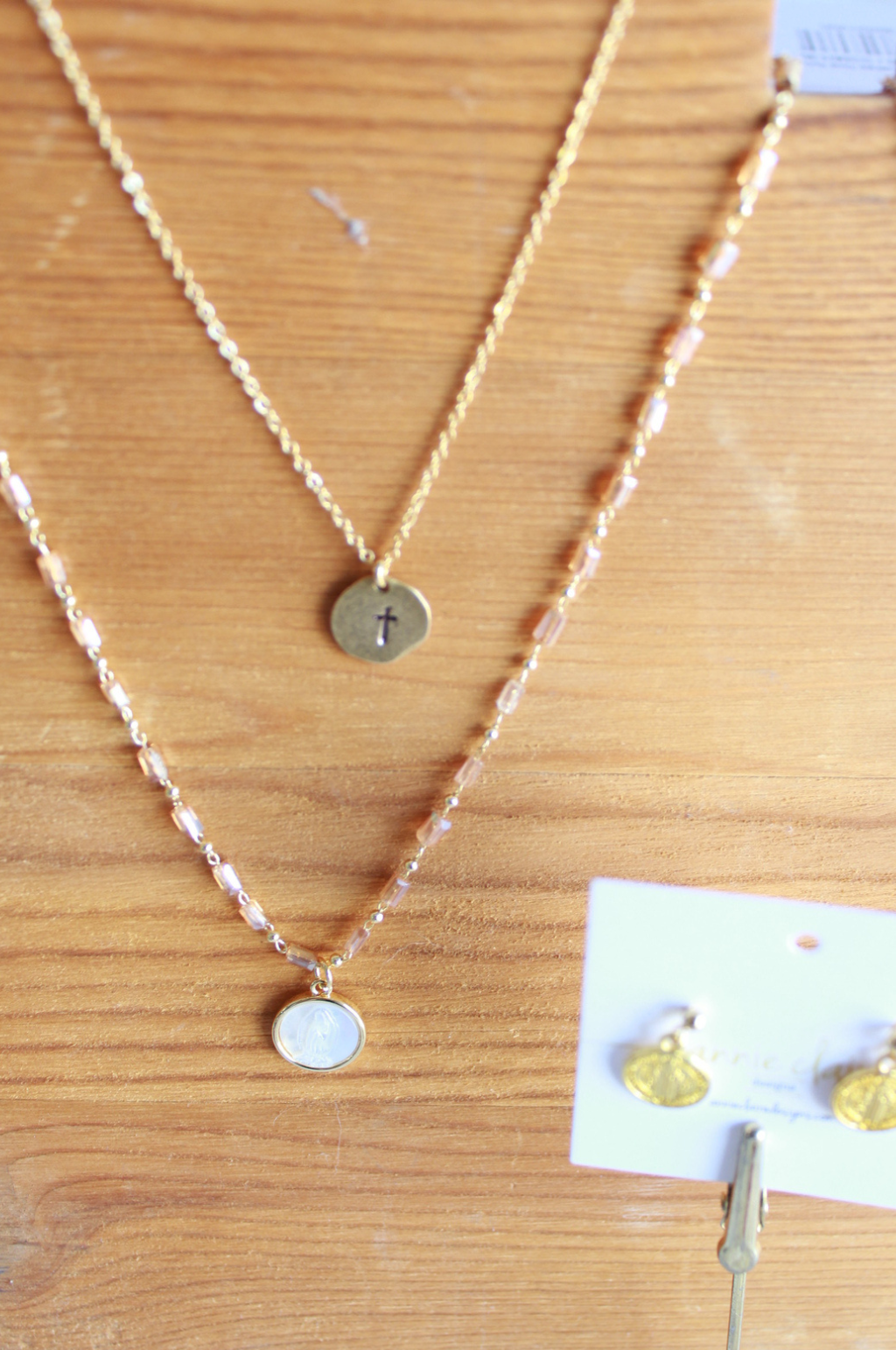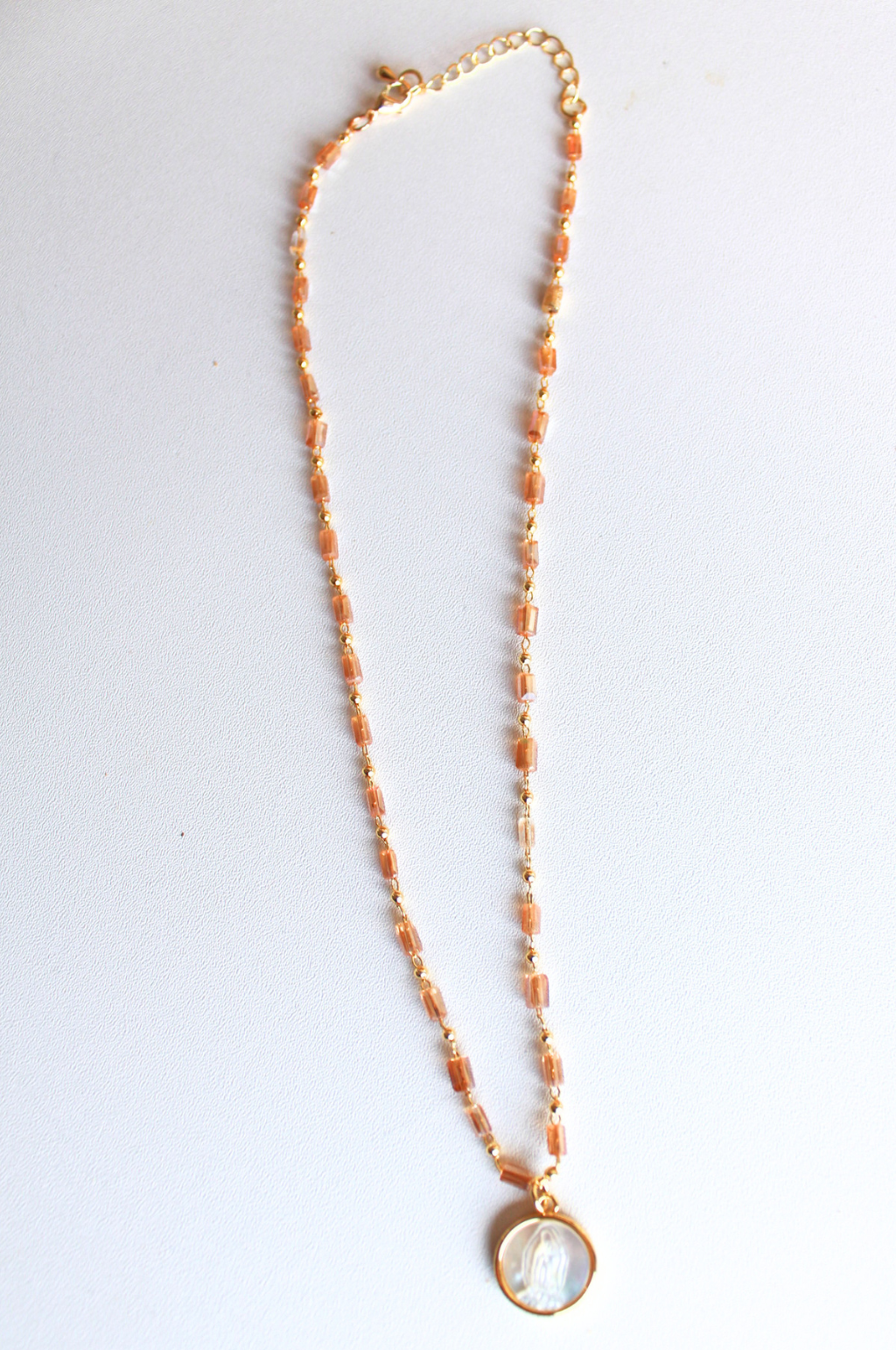 Carry faith and elegance close to your heart with this pretty necklace. Featuring a finely crafted Mary charm on a beautiful rosary style chain, this necklace is a beautiful expression of devotion and style.