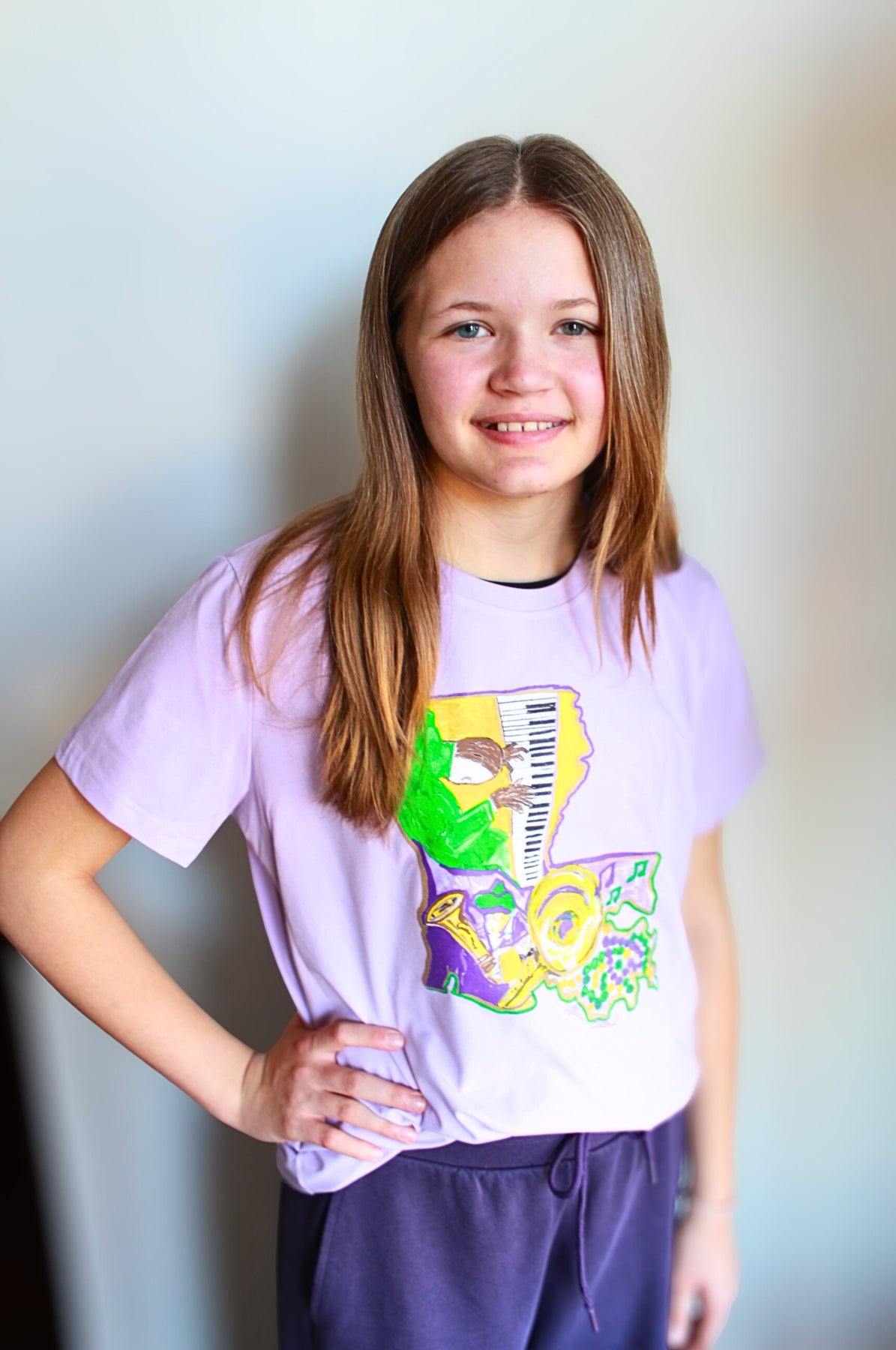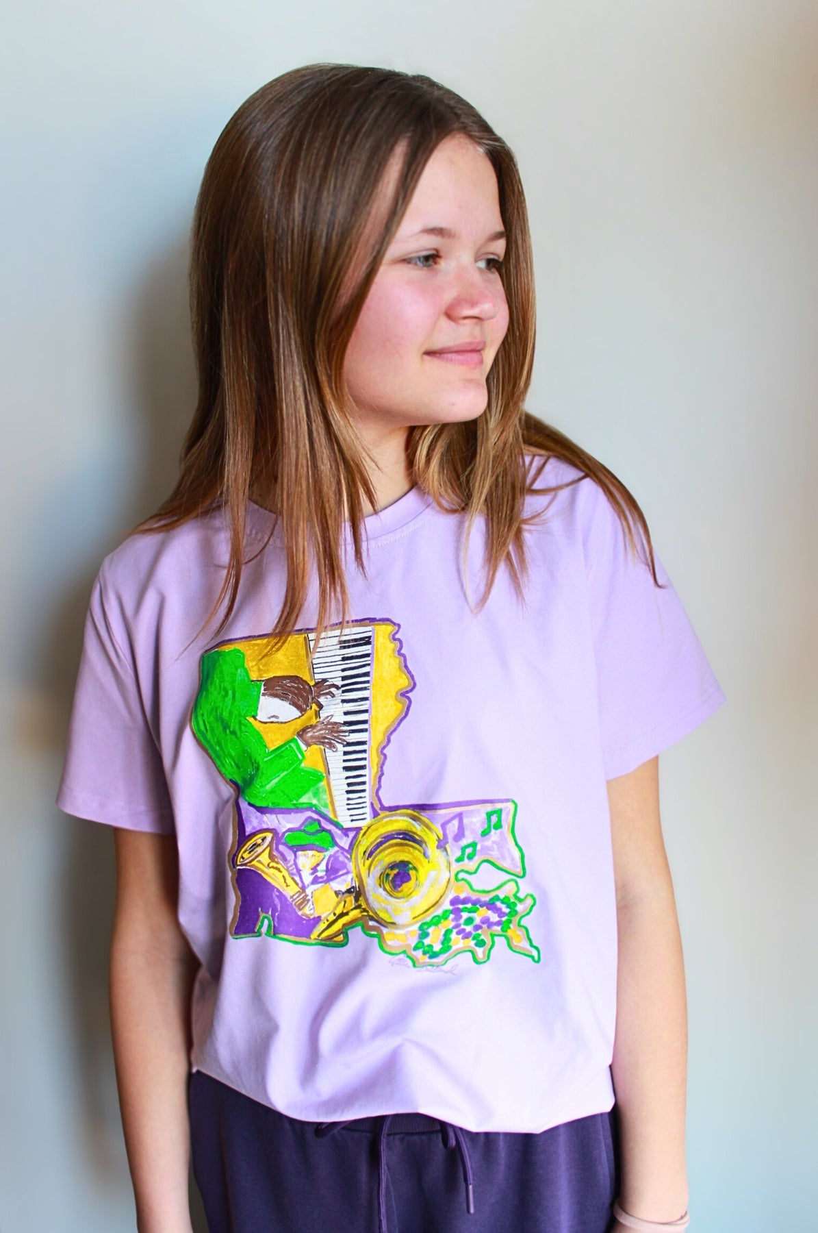 Artwork by the talented Allison Dillard, screen-printed on our SoSis signature tees—including the mid-length boxy sparkle tee in ivory and the classic signature tee in lavender. This original design showcases an impressionist art style featuring a piano player, horn players, a tuba, and rich Louisiana symbolism throughout. Subtle pops of metallic gold screen print are woven into the artwork, adding dimension and a hint of shimmer that catches the light beautifully. A wearable work of art that celebrates music, culture, and Louisiana soul—perfect for Carnival season and beyond. 💜💛💚